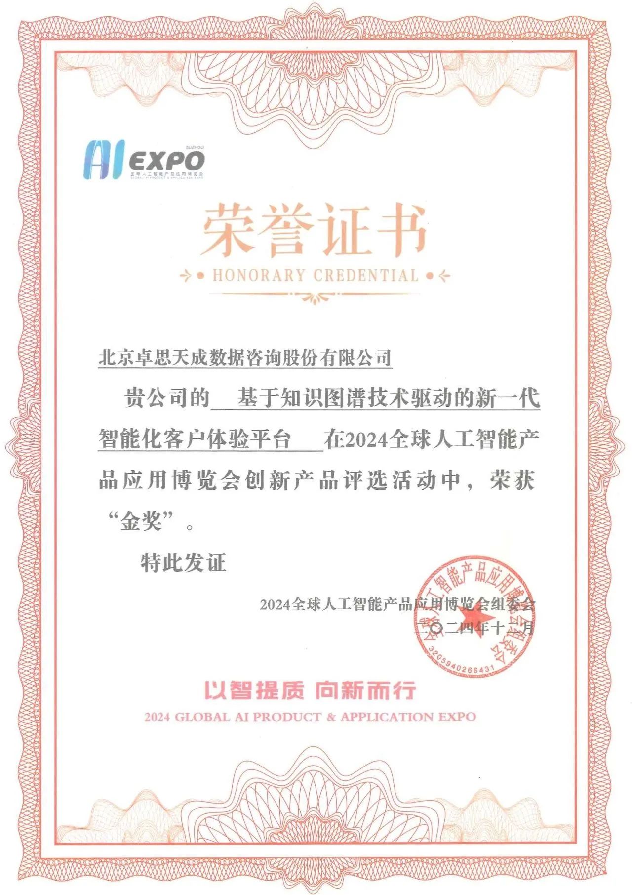 近日,“2024全球人工智能产品应用博览会”(“全球智博会”)于苏州举行,会上重磅揭晓了十大产品金奖。张家口产业投资控股集团(简称:张家口产投)被投企业——国内头部CEM客户体验管理平台北京卓思天成数据咨询股份有限公司(简称:卓思)“基于知识图谱技术驱动的新一代智能化客户体验平台”凭借技术先进性、创新性和应用性成功入选,一同上榜的还有华为、煤炭科学研究总院等企业及国家级科研机构。