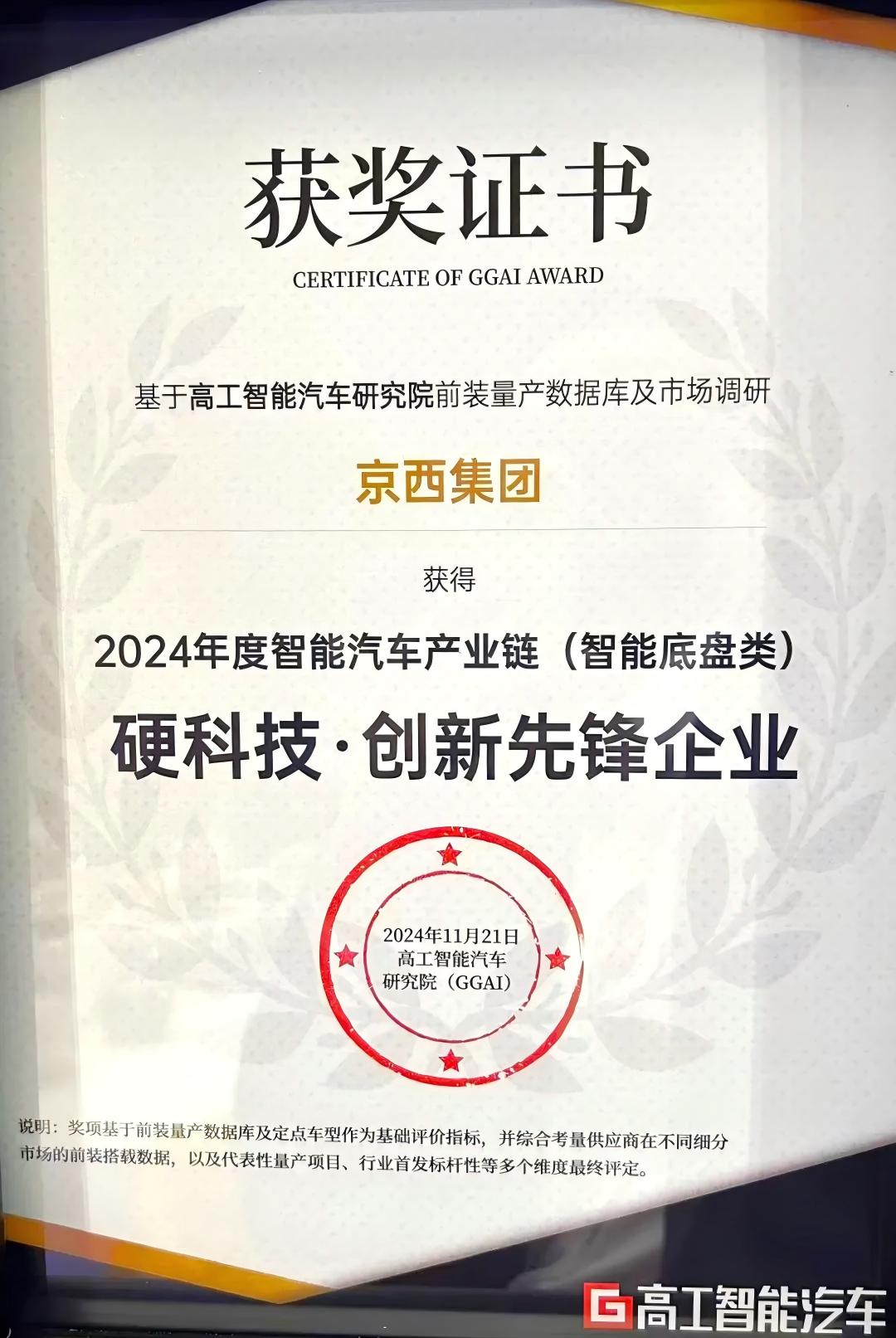 权威产业研究机构高工智能汽车昨日于江苏太仓颁发“2024年度智能汽车产业链硬科技•创新先锋企业”奖。京西集团凭借国产先进主动悬架技术赋能国内智能底盘产业创新和突破斩获该奖项。京西集团中国区CTO陈伟刚博士应邀领奖并在2024智能汽车产业链硬科技趋势峰会致演讲。