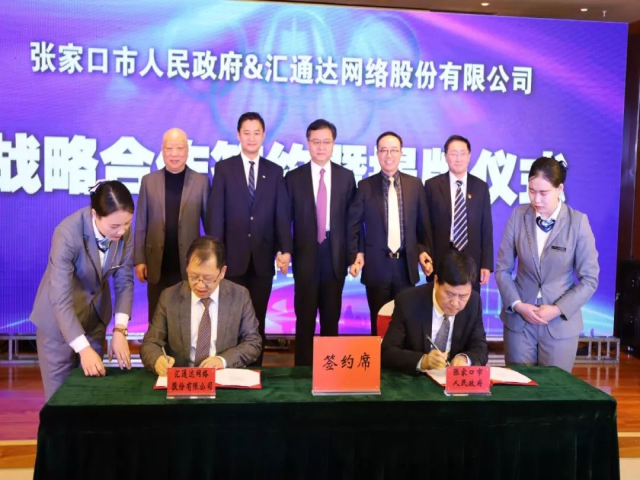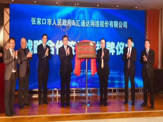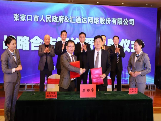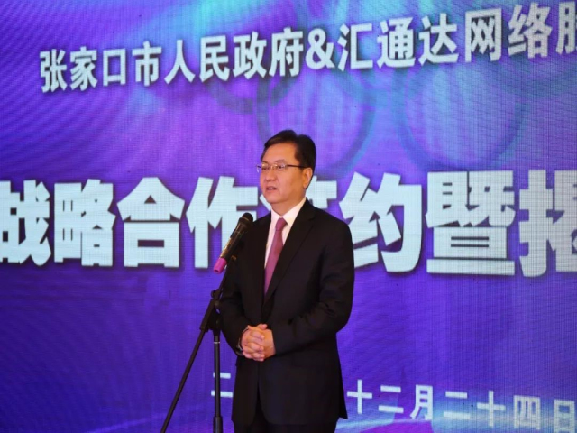 2018年12月24日,张家口市人民政府与汇通达网络股份有限公司举行战略合作签约暨揭牌仪式。张家口市政府市长武卫东、市政府常务副市长郭英、市政府秘书长杨千河、桥东区委书记王建军、五星控股集团总裁王健、汇通达副总裁赵亮生、中美绿色基金CEO 白波、金控集团总裁东小杰、金控集团副董事长昝杰亮、市直区直相关部门主要负责同志及相关企业高层管理人员近60人出席本次活动。杨千河秘书长主持签约暨揭牌仪式。