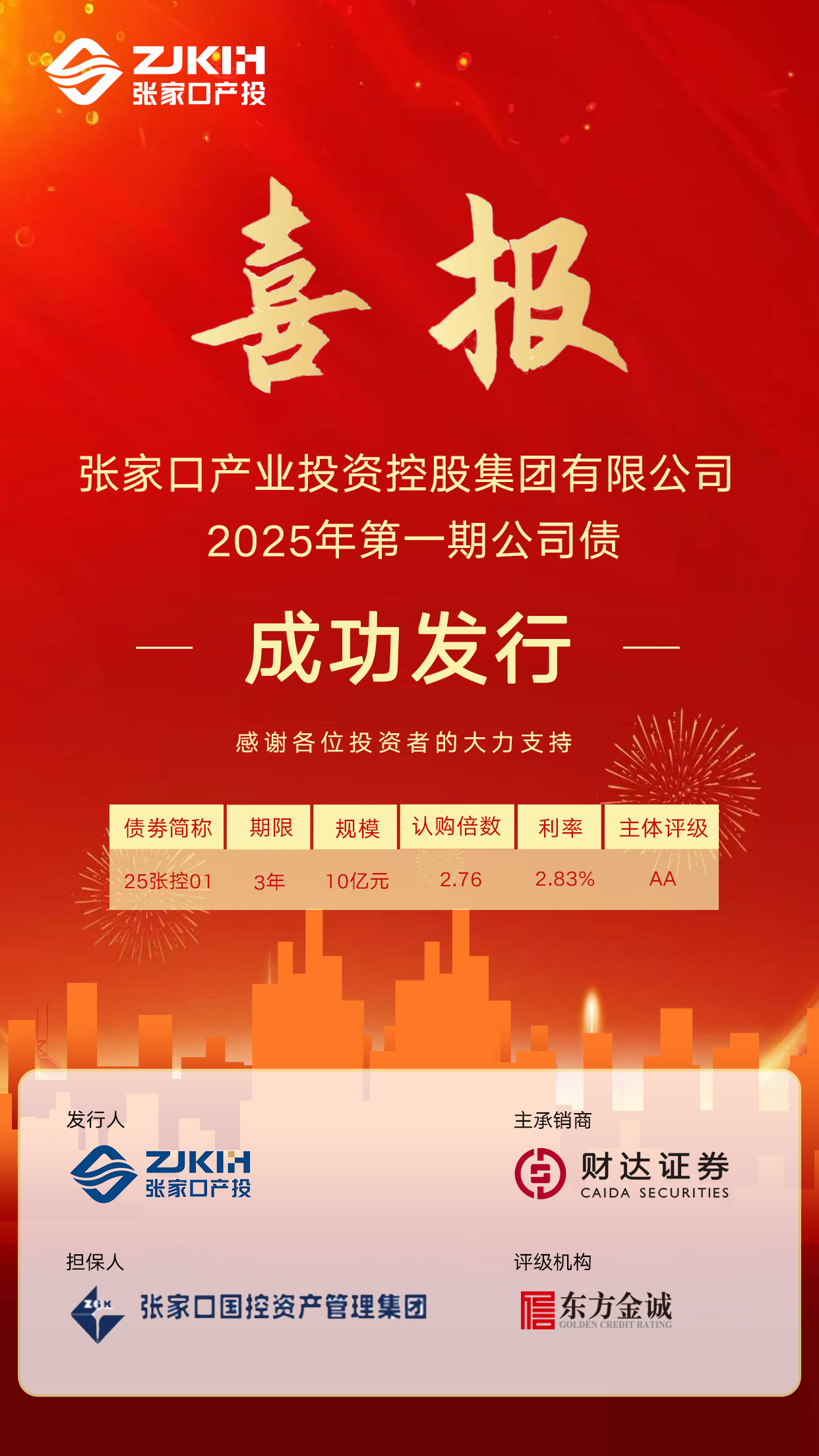 2025年4月17日,张家口产业投资控股集团有限公司(以下简称:张家口产投)2025年面向专业投资者非公开成功发行第一期公司债券。本次债券发行规模高达10亿元,期限为3年,票面利率2.83%,全场认购倍数超过2.76倍,一举创下张家口公司债及同期限债券票面利率的历史新低。此次发行凭借较低的票面利率和较高的认购倍数,凸显了资本市场对张家口产投综合实力与发展前景的深度认可。