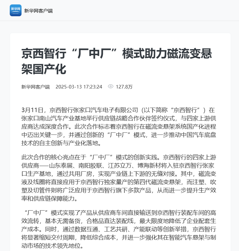 2025年3月13日新华网客户端《京西智行“厂中厂”模式助力磁流变悬架国产化》截图