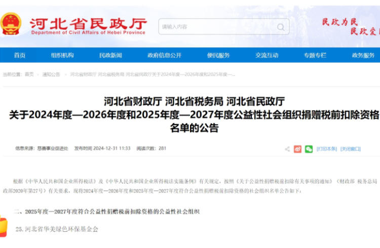 河北省华美绿色环保基金会获得公益性社会组织捐赠税前扣除资格
