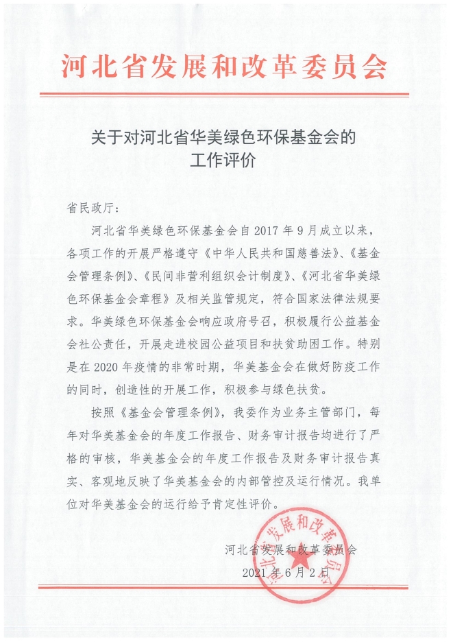 近日,张家口金融控股集团下属公益组织——河北省华美绿色环保基金会(以下简称“华美基金会”)凭借良好的公益成果,受到河北省发展和改革委员会的充分肯定。