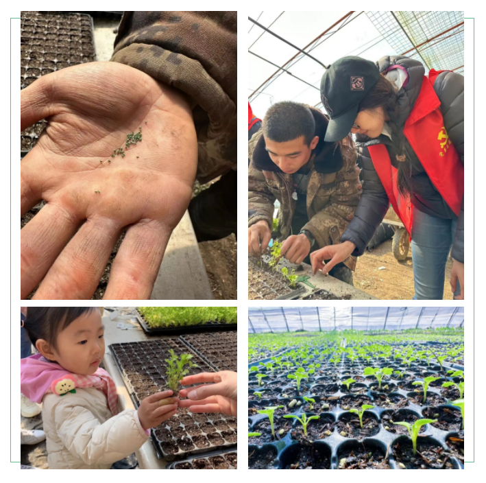 认识种子,学习如何育苗,把土壤浇湿,用铲拍打,划出一条条线,开始移栽,每一个步骤都是新奇而充满希望的。